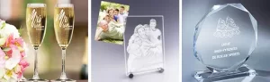 هدایای تبلیغاتی: بسیاری از شرکت‌ها از حکاکی لیزری برای ایجاد هدایای تبلیغاتی استفاده می‌کنند که شامل لوگو یا نام برند بر روی محصولات شیشه‌ای است .