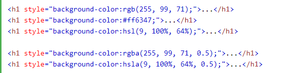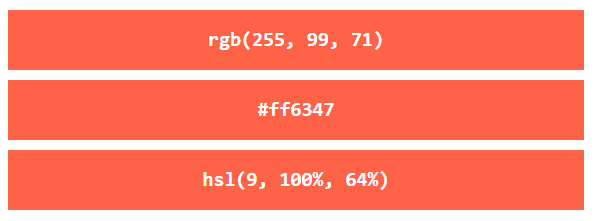 در HTML رنگ ها می توانند با استفاده از مقادیر RGB ،HEX ,HSL ,RGBA و HSLA هم مشخص شوند. سه مولفه ی div در پایین، رنگ پس زمینه ی خود را با استفاده از مقادیر RGB ،HEX و HSL تنظیم کرده اند.