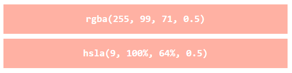 دو مولفه ی div پایین رنگ پس زمینه ی خود را با مقادیر RGBA و HSLA تنظیم کرده اند، که مقدار چهارمی Alpha هست که میزان شفافیت رنگ را تعیین می کند که می تواند مقداری بین 0 و 1 داشته باشد.
