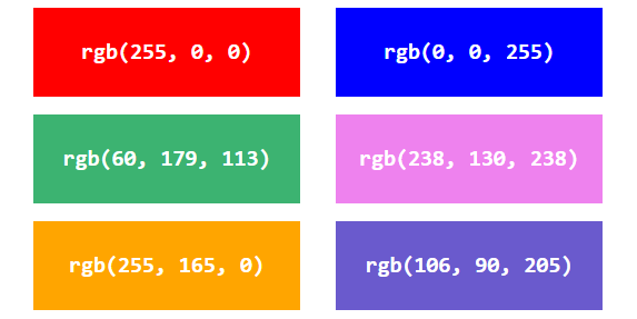 به عنوان مثال rgb(255, 0, 0)، به عنوان رنگ قرمز نمایش داده می شود زیرا که قرمز در بالاترین مقدارش قرار دارد و دو رنگ دیگر صفر هستند.