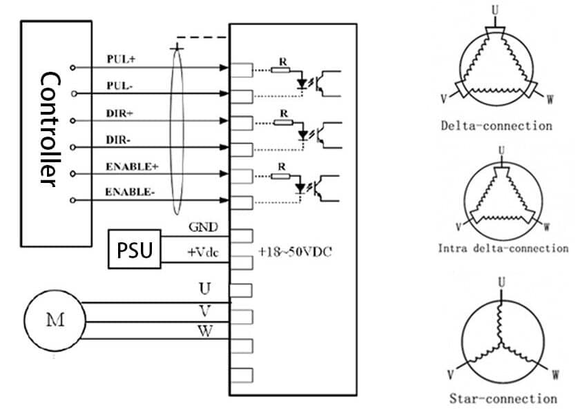 در حالت تک پالس (پالس/جهت) ، این ورودی سیگنال پالس را نشان می دهد ، هر یک از لبه های بالا یا پایین فعال است (قابل تنظیم نرم افزار) ؛ 4-5 ولت در حالت PUL-HIGH ، 0-0.5 ولت در زمان PUL-LOW. در حالت دو پالس (پالس/پالس) ، این ورودی نشان دهنده پالس در جهت عقربه های ساعت (CW) است که هم در سطح بالا و هم در سطح پایین (قابل تنظیم نرم افزار) فعال است. برای پاسخ مطمئن ، عرض پالس باید بیش از 2.5 ما باشد. سریها برای محدود کردن جریان هنگام +12V یا +24V استفاده می شود. همان سیگنال های DIR و ENA.